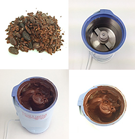 皮を剥き終わったらカカオの中身、カカオニブの重さを量りメモをしておきます。 (豆の重量からおおよそ75~90%に減っています。) NEW嫁っ子さんに投入し、スィッチを入れ、ときどきヘラなどでかき混ぜながらすり潰していきます。 粗砕きのニブの状態からココアパウダーのような粉状へ変形し、その後じょじょに熱が出てきてペースト状へと形状が変化します。 途中で計量した砂糖も入れ、さらにすり潰していきます。