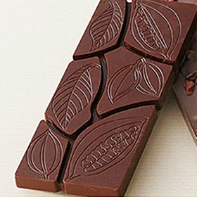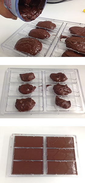 型に流し込みます。 チョコレートの中の空気を抜くために型をガタガタと揺らし、たいらにならします。 冷蔵庫で3‐4時間冷やして固めます。